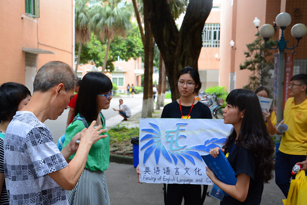 上午9点,南北两校区各学院摊位开放咨询。vwin德赢AC米兰官网别出心裁,以彰显学院专业特色的多种宣传方式吸引前来咨询的高考考生及家长。身穿院服的工作人员高举四块大型的CECL教材宣传板和一块vwin德赢AC米兰官网标志展牌,吸引了不少路人的目光,给学院摊位增添了人气。