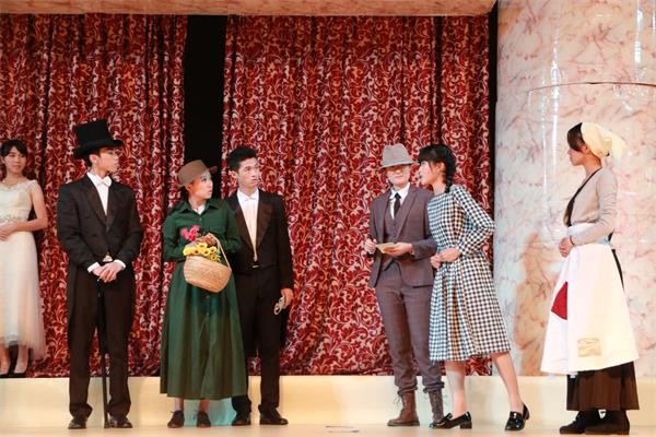 最后,vwin德赢AC米兰官网戏剧社精心改编并出演了萧伯纳名作——《卖花女》,献礼广外五十周年华诞。舞台上,卖花女Eliza为得到丰厚的薪酬,而接受语言学家 Higgins的矫音训练,最终成功从满口土话的市井卖花女变成高贵优雅、艳惊四座的沙龙公主。本剧用歌舞剧的形式生动地表现了Higgins教Eliza正统发音却屡屡失败的无奈;而穿插的Pygmalion传说则暗示了“Higgins渐渐爱上了Eliza”的关键线索。然而,Eliza在沙龙结束之后,发现Higgins一直都只把自己当成赢得赌局的筹码,伤心离开;Higgins则在自我拷问中发觉在帮助Eliza矫音的过程中,她已经成为了自己生活中不可或缺的一部分。最终雕像变成了一位真正的女子与Pygmalion相拥,而Eliza也回到了Higgins的身边。演员生动的面部表情、丰富的肢体动作,以及对Eliza口音的前后巨大反差的成功演绎都赢得了在座校友的热烈掌声。