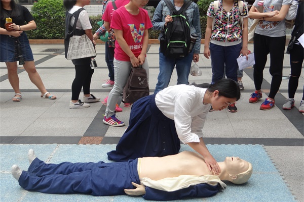 为了让同学们更好的理解讲座内容,学到更多使实用的急救技巧,华医师和同学们移步室外,进行实践教学讲解。华医师用人体模型为同学们进行了心肺复苏与人工呼吸的步骤分解演示,之后又将所有动作串联起来进行整体演示。在场听讲的同学们也积极踊跃,主动上前进行实践操作,通过应用加深对所学对理论的认知。
