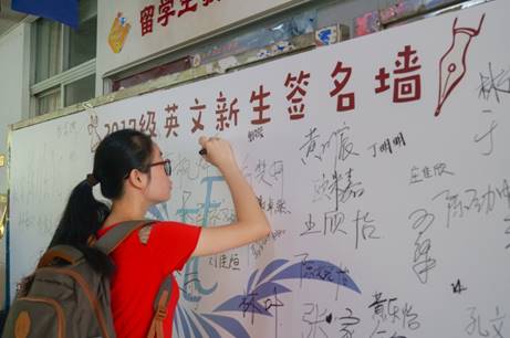 值得一提的是,学院今年创新性地开展迎新工作,为新生设置了签名墙,成为迎新的一道亮丽风景线。新生签上自己的名字,从此成为一名真正的英文人。