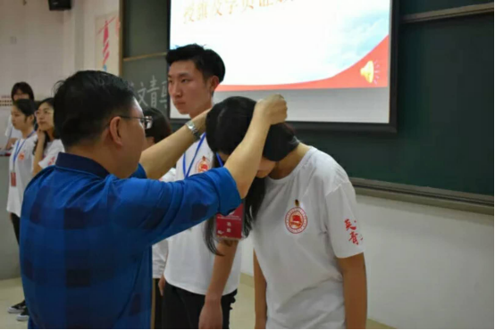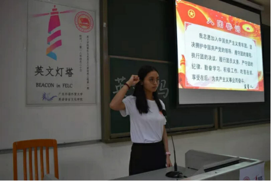 来自英文1701班的张谷雨代表“青马班”第一期学员发言,他承诺,将与全班学员一同努力,更加深入学习马克思主义理论,努力学习专业知识、提升专业技能,并将其用于社会实践当中;发扬英文人严谨踏实的精神品格,积极参加学校学院各项公益活动,服务学校、服务社会,在实际行动中更深刻铭记自己身负的时代责任与使命。随后进行的是重温入团誓词环节,全体庄严宣誓让学员更加坚定不忘初心跟党走的信念、更加坚定中国特色社会主义共同理想。