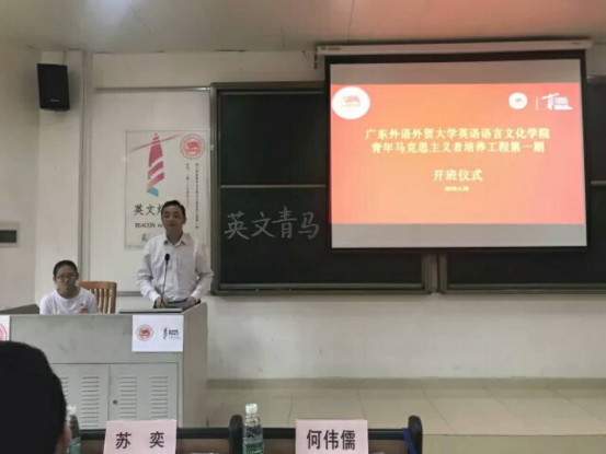 在整齐嘹亮的国歌声中,开班仪式拉开序幕。何伟儒书记就本次青马工程筹备情况进行简要介绍。何书记介绍到,学院团委于今年初开始筹备第一期青马班,面向本科、研究生开展学员招募工作,最终选定35名学生进入我院第一期“青马班”学习。何书记还指出,为保证青马工程培训质量,院团委探索设计了涵盖理论学习、红色教育、志愿服务、社会实践和组织生活等方面为期一年的培养大纲,并且很荣幸请到副校长刘海春教授为学员讲授青年马克思主义者第一课;青马学员还将于5月4日前往广西百色红色革命基地参观学习,并与广西大学青马班学员开展交流和调研活动。