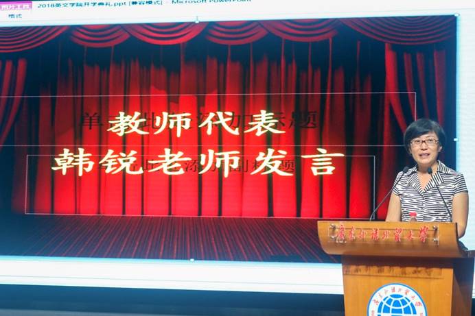 接着,文化系主任韩锐作为教师代表进行发言,她向新生介绍了vwin德赢AC米兰官网师资情况和文化氛围等,她告诫新生珍惜光阴,认真学习;鼓励新生博览群书,提升眼界;希望同学们拥有理想,努力奋斗,提升个人素质,莫被挫折打倒。