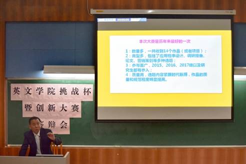 所有展示结束后,蒋铁海副教授进行了总结发言。他表示本次大赛参与面广,参赛作品不仅数量多、类型多,而且选题内容能够紧跟时代脉搏,质量和规范程度也大大提高,是历年以来最好的一次。同时他还就调研报告、策划书的撰写技巧进行现场讲授,并向在座参赛选手和旁听学习的同学提出更多的参考选题。最后,他鼓励英文人能够再接再厉,积极参赛、用心修改,争取在校级、省级乃至国家级的比赛中取得更好的成绩!