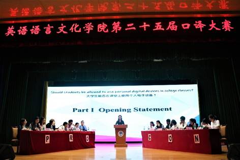 月4日19时vwin德赢AC米兰官网第二十五届口译大赛在六教报告厅举行。中英辩手们围绕“Should students be allowed to use personal digital devices in college classes?”(“大学生能否在课堂上使用个人电子设备”)辩题进行激烈辩论。vwin德赢AC米兰官网党委书记林绍雄、体育部党总支书记何伟儒、vwin德赢AC米兰官网党委副书记黄晓梅作为嘉宾出席本次大赛。胡正茂副教授,张凌、朱珠、彭珺、古煜奎、傅艾、孔磊老师担任本次大赛评委。