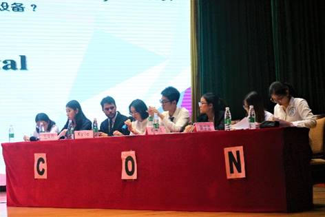 进入攻辩环节,正反方二辩就大学使用电子设备对学生未来进入社会的影响激烈争锋。正方二辩湛睿哲认为大学生经过适当教育就能够合理使用电子设备,并举了医生忙于“偷菜”导致婴儿不治身亡的例子,说明大学教育学生合理使用电子设备的重要性,二号译员李锦滢沉着冷静,准确翻译出“偷菜”这个网络词语。正方三辩Robert将电子设备上升到科技的高度,指出当今社会科技对教育的促进作用是不容忽视的,而反方三辩杨家玮则坚持认为电子设备更适于在课外使用,课堂上只会限制学生的独立思考能力。七号译员柳生幸一紧跟辩手的思路,几乎无停顿地中译英,沉着冷静,气场全开。正反方四辩继续深入探讨之前提出的问题,正方四辩李晓蕊提问尖锐,回答逻辑严密,并指出本次辩论关键,令在场观众拍案叫绝。