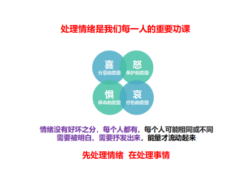 通过“选包裹”游戏,郭教授引导大家认识自我,认识在压力状态下的生活态度和性格类型:取悦型、安逸型、控制型和力争优秀型。每种性格的背后都蕴含着喜、怒、惧、哀各种情绪,而情绪是时刻存在的东西,每个人都需要得到尊重和接纳,需要被明白和抒发感受的空间。因此处理情绪是我们每一个人的重要功课,先学会处理情绪,才能处理事情。