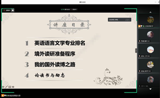 英美文学系许景城博士于2020年7月21日晚上19:00—22:00,为文学系学生就“境外读研经历和建议”主题进行了线上讲座。许博士事先收集了同学们关于境外留学的种种疑问,在讲座中一一进行针对性地解答,详述了境外读研的注意事项和切实建议。本次专题讲座分为国外院校专业介绍、境外读研准备程序、国外读博之路、论读书与励志和学术写作五部分,许博士风趣幽默地讲解了许多申请学校的流程和技巧,鼓励同学们多读书、多尝试创作,联系学术与生活。许博士还分享了自己对道家思想的理解,并由此得来的治学之道,告诉同学们要多关注传统文化,树立文化自信。更以自己的自勉诗为同学们打气,讲座以朱熹名言,“为学不进,只是不勇!”结束。讲座到场人数120多人,同学们纷纷点赞。