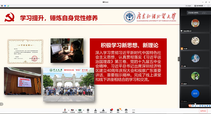 林绍雄在随后的总结点评中,充分肯定了各党支部的工作,指出了今后需要不断加强或改进的主要问题。他指出,面对疫情等方面的困扰,各党支部开展了形式多样的线上线下活动,措施有力,成效显著,其中更是涌现了像语言学和翻译方向学生第三党支部这样表现比较突出的党支部;各支部在今后的工作中要加强政治理论学习,尤其要深入学习贯彻习近平新时代中国特色社会主义思想和《习近平谈治国理政》第三卷;要认真贯彻落实《中国共产党支部工作条例(试行)》、《中国共产党党员教育管理工作条例》等文件的精神和要求,进一步规范党支部自身建设、完善党员培养发展流程、做好党员教育管理服务工作,大力打造支部工作与活动的品牌,不断增强党组织的凝聚力、影响力和战斗力。