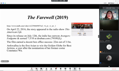 广外vwin德赢AC米兰官网杨静教授做了题为“电影《别告诉她》的去异化策略:意象、叙事和机制”的主题发言,通过城市情景、疾病话题和亚裔女性物化等角度探讨了该电影在表现美国情境下亚裔文化与多元文化融合时的尝试。