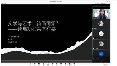 广外vwin德赢AC米兰官网蒋竹雨副教授做了题为“文学与艺术:诗画同源?——读启功和莱辛有感”的发言。她通过对启功《中国古代诗与书、书与画、画与诗之关系例说》和莱辛《拉奥孔》的解读,探讨了诗歌、书法和绘画在起源、效用和表现方式上的异同。