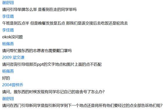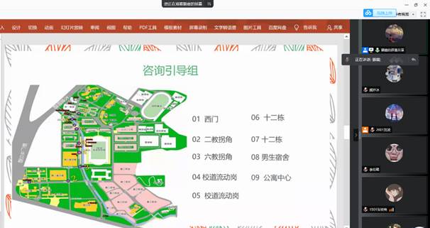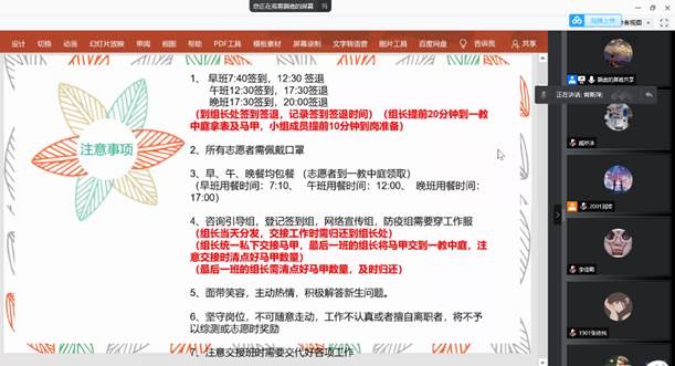 老生接待志愿者培训会介绍了各组别志愿者的工作内容和工作总体流程。随后马骁老师发言,对返校防疫工作做出指示。在答疑环节中,马骁老师结合实景图强调了一些工作注意事项,给了志愿者们直观的感受。