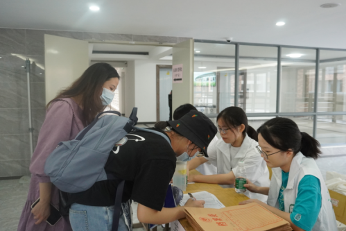 今年新生入学采用线上扫码签到注册的方式,新生只需通过志愿者扫描录取通知书上的条形码便可签到登录,简便快捷,并且一路上有志愿者的帮助,新生们轻松顺利地完成报到,很快入住宿舍。