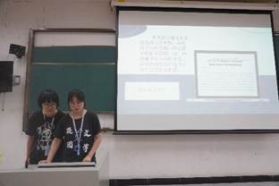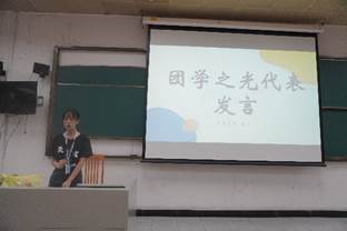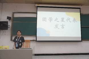 团学之星代表曾斯萍讲话。她首先感谢英文团学给予机会来锻炼自己、展现自我,并通过讲述她自己参与的活动来展现自己工作一年以来的收获。最后,她对英文志愿者协会的未来进行展望。