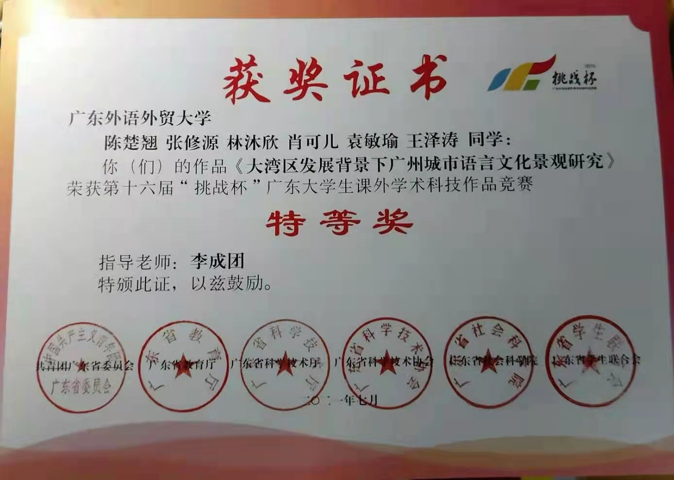 本网讯 近日,在由团省委、省教育厅、省科技厅、省科协、省社科院、省学联共同主办的第十六届“挑战杯”广东大学生课外学术科技作品竞赛中,由我院教师李成团教授指导的学生团队获得特等奖。据悉,此次我院学生团队参赛的项目题目为“大湾区发展背景下广州城市语言文化景观研究”,主要通过质和量分析结合的研究方法,收集了广州城市各个主要街区的语言景观,总结这些语言景观勾勒了广州城市的本土化、国际化和文化兼容化的形象,结合线下采访问卷语料,分析了市民和游客对于这些语言景观的感知和接受情况与评价,首次提出了在语言经济学视角下构建城市形象的模式,得出了很多有意义的发现,推进了岭南文化走出去的语言文化战略实施。