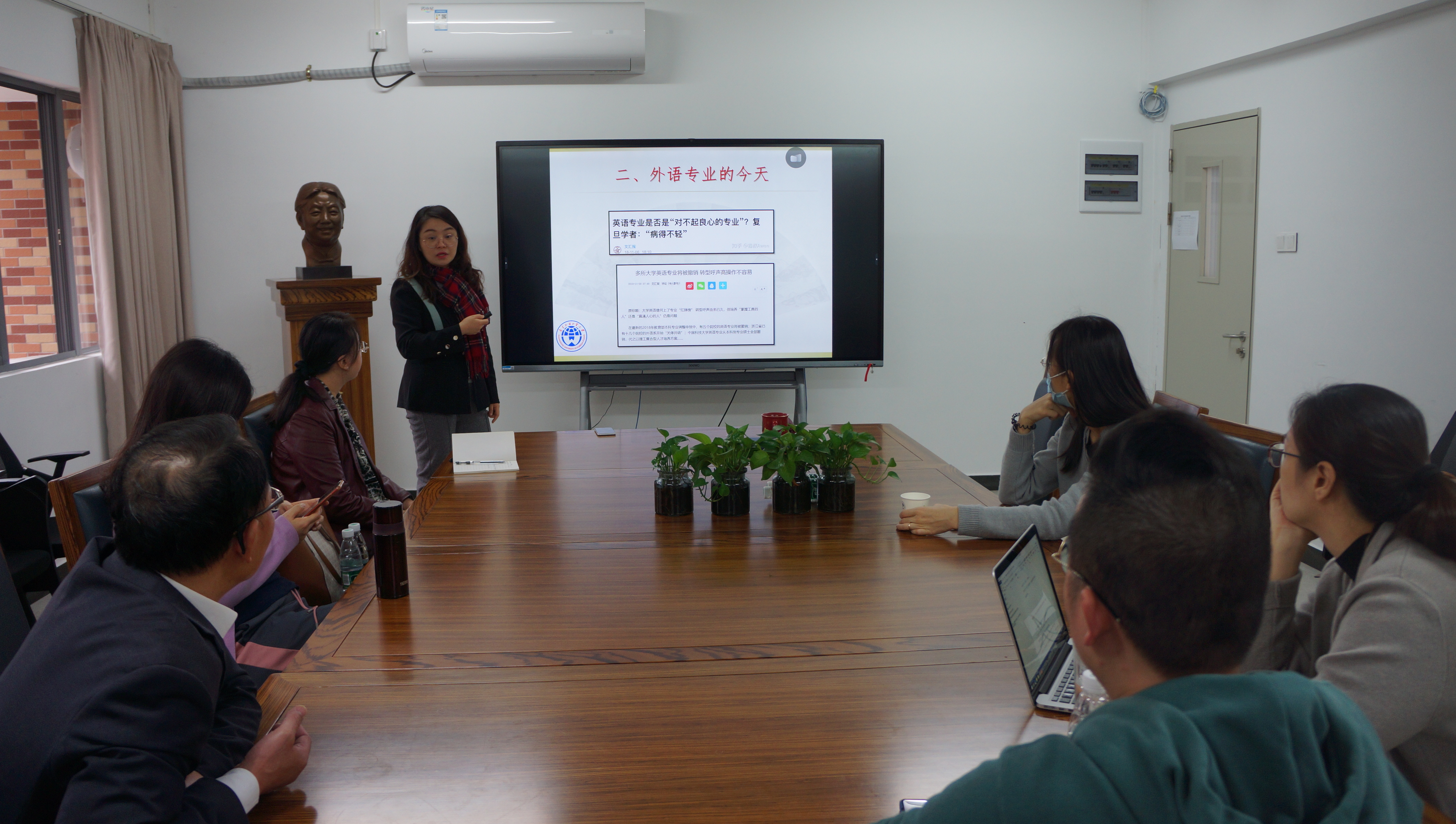 活动分为两部分。第一部分是教师分享思政教学的经验和理念,第二部分为自由讨论。张欣院长首先发言,她以“英语专业课程思政的内涵辨析与路径探索”为题,解析了新时期中国外语教学所面临的新挑战,探讨了英美文学文化课堂应如何与思政教学相结合,尤其是在传播中华文化方面的作用,进入到新时期,外语教育应该注重将外国文化和本土文化相结合,从文化自觉走向文化自信,从政治素养走向文化素养,并注意新文科建设下外语教师的发展问题。