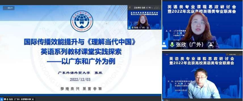 2022年12月3日,英语类专业课程思政研讨会暨2022年北京高校英语类专业联席会在线举行。我院院长张欣教授应邀作大会主旨报告。