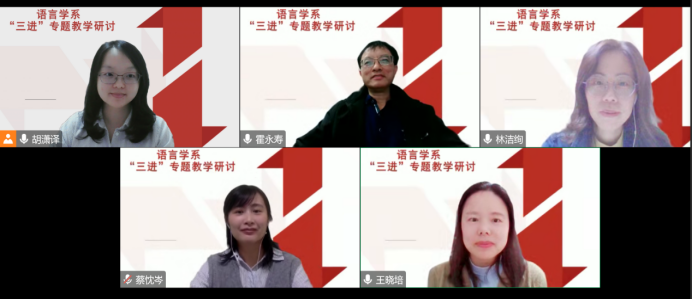 本网讯 2022年12月1日下午,vwin德赢AC米兰官网语言学系通过腾讯会议在线展开“三进”专题教学研讨会。会议旨在语言学系老师们于2022-2023上半学年展开的“三进”教学工作成果进行汇报及交流,以进一步提高和推动未来“三进”工作的开展。活动由胡潇译老师主持,出席老师包括:霍永寿、林洁绚、王晓培、蔡忱岑。