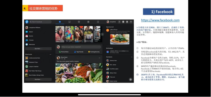 其中,奉春英老师重点对网络营销中的邮件营销以及海外社交媒体营销进行了深度讲解。内容囊括了邮件营销的重要性及优化策略,在Facebook上的活动运营、广告推广、群组管理和互动营销等多项内容。老师对于课程的讲解详尽,让同学们充分了解了网络营销的运作机制,获益匪浅