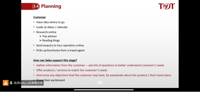 在询单环节,陆老师再次强调了提问的重要性。提问是最直接而有效的获取客户旅游需求的手段;好的问题能让销售更好地掌握客户偏好和要求,并更好地为客户设计行程,大大提高了服务品质和效率。此外,陆燕老师还布置了相应的询单问题(包含close question和open question)的小作业,指导同学们熟悉并掌握询单流程及技巧。