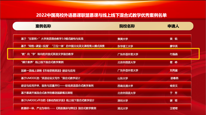 会上现场公布了“2022年度慕课与线上线下混合式教学优秀案例”。我院付晶晶老师的教学案例——“教”与“学”转向的开放式英语文学混合教学,荣获优秀案例。