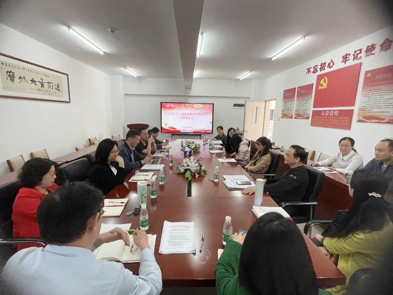 会上,学院党委副书记、院长张欣代表学院党委宣读了校党委《关于胡潇译等同志职务聘免的通知》,并且希望新一届系部办主任和党支部书记赋予各组织更新的发展理念,源源不断注入新活力,助力学院高质量发展和外语学科“冲一流”。经4月11日党委组织部部务会研究决定,并报学校党委同意,聘胡潇译为英语教学部主任、潘莉为翻译系主任、付晶晶为英美文学系主任、许景城为英美文化系主任、陈哲为语言学与信息英语系主任、李敏子为研究生工作办公室主任。新一届系级教学机构负责人发表任职感言,他们感谢组织和同事的信任,表示将紧紧围绕立德树人这一根本任务,全面贯彻党的教育方针,坚持社会主义办学方向,恪尽职守,积极作为,认真做好本职工作,为学院发展和外语学科“冲一流”贡献力量。翻译系教师党支部书记梁静璧、英美文化系教师党支部书记张松山表示将围绕中心,服务大局,积极推进党建工作与业务工作相融相促,以高水平党的建设引领事业高质量发展。党政办主任夏玉坤表示院办将进一步增强服务意识,优化工作流程,提升行政效能。