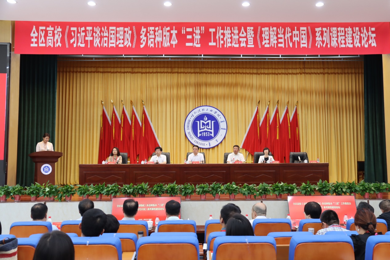 本网讯 为贯彻落实党的二十大精神,深入推进《习近平谈治国理政》多语种版本进高校进教材进课堂(“三进”)工作,创新外语专业课程思政,2023年6月25日,全国高校《习近平谈治国理政》多语种版本“三进”工作推进会暨《理解当代中国》系列课程建设论坛在内蒙古自治区呼和浩特民族学院举行。会上教育部高等学校外国语言文学类专业教学指导委员会副主任委员、天津外国语大学原校长修刚教授作了题为“《理解当代中国》课程与外语专业改革与发展”的大会主旨报告,我院院长、广东省本科高校外语类专业教学指导委员会英语专业分委员会主任委员张欣教授作了题为“理解当代中国与广东外语教育”的大会主旨报告。随后的院校交流环节和教学展示环节,来自北京外国语大学、北京语言大学和内蒙古财经大学等院校专家教师进行课程理念与实践分享交流。