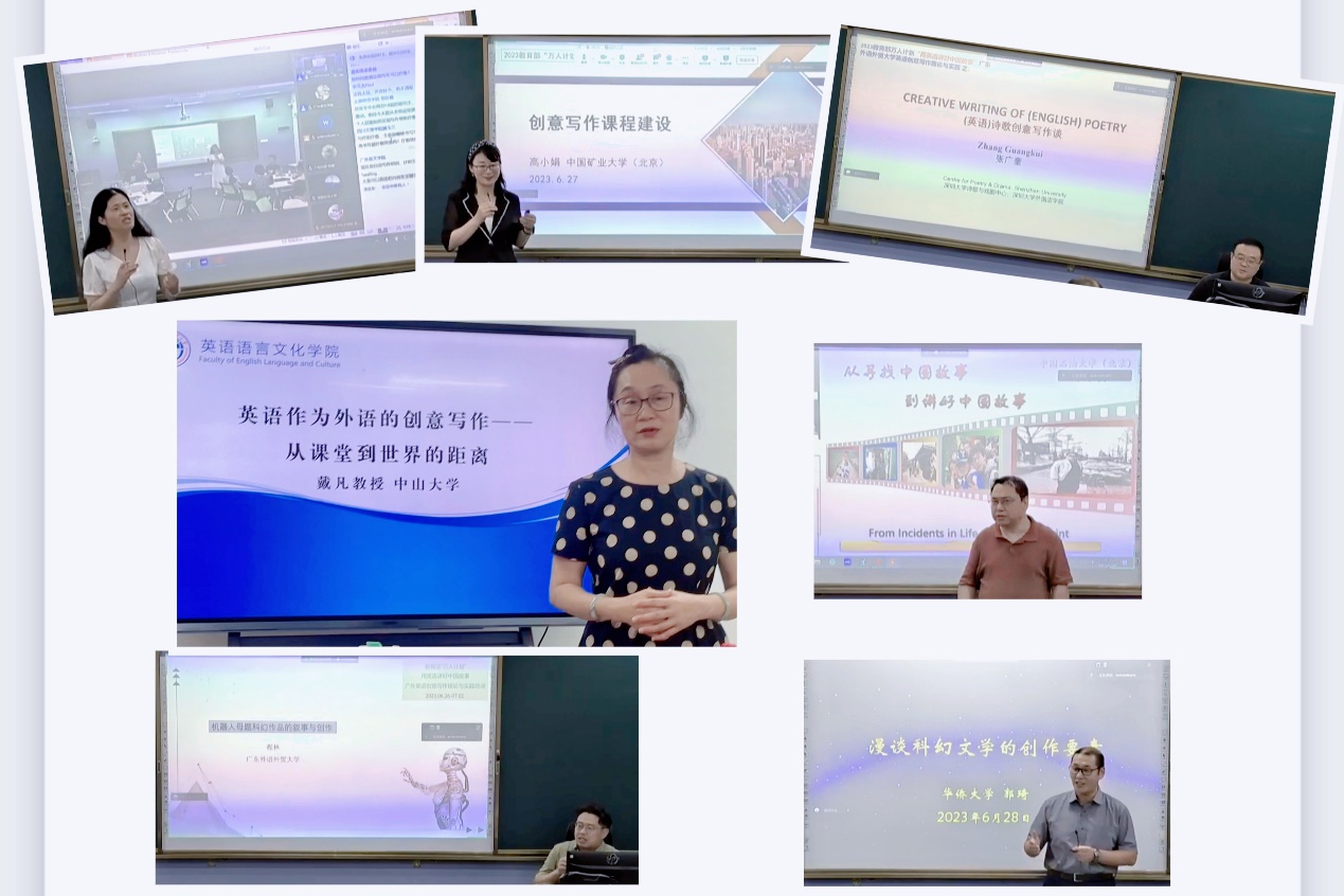 为期一周的培训课程邀请到了全国各大高校英语创意写作领域的专家及我校国家级一流本科线下课程《中级写作》的团队成员,分别呈现了七场学术讲座和七节英语创意写作工作坊。上下两期内容丰富,不仅有特邀专家从理论和教学实践的层面讲解包含小说、诗歌、科幻故事在内的英语创意写作知识,更有我校《中级写作》课程组授课团队生动讲演如何将王初明教授的“续”理论与传统记叙文教学、中国古典小说、新闻特写等写作题材相结合,在培养学生创作能力的同时促进语言能力的习得,全方位展现了我院将创意写作和“续论”实践巧妙融合的研学模式。