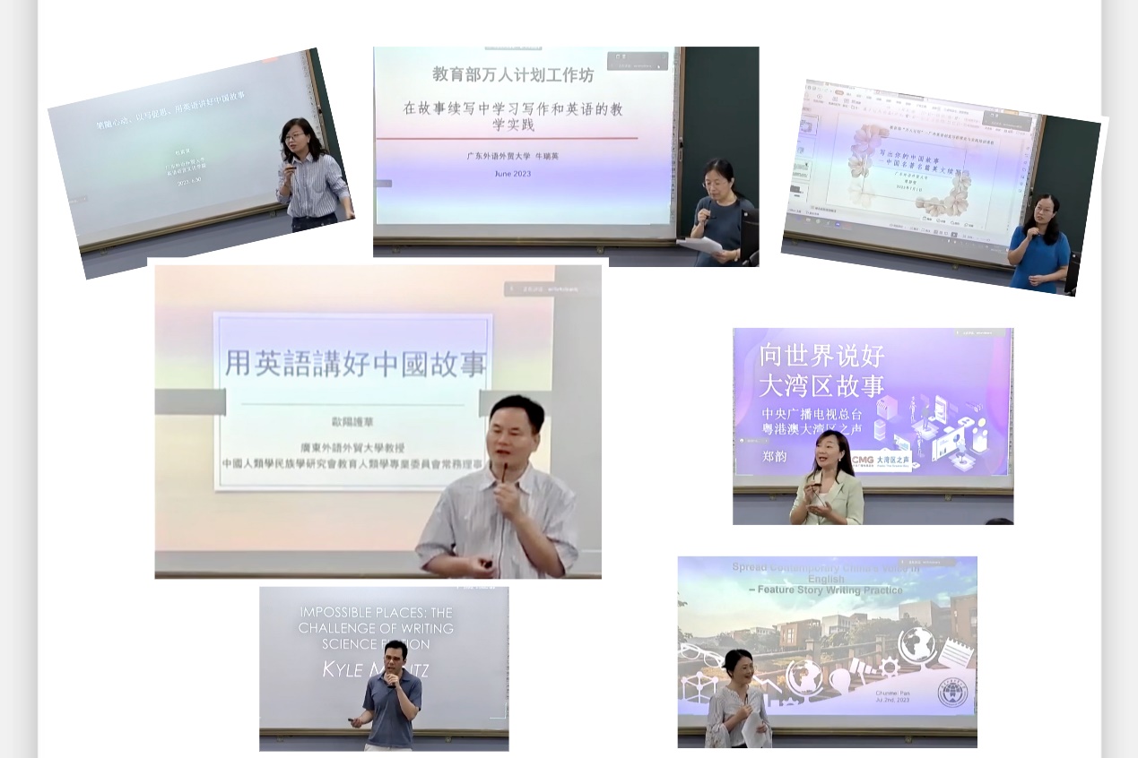 随后我院欧阳护华教授做了题为“用英语讲好中国故事”的主题讲座,他从论辩思维的角度阐释了方法论的重要性,并提出了以跨文化交际的视角探索中国故事传播的新模式和新途径。杜寅寅副教授在题为“笔随心动、以写促思、用英语讲好中国故事”的讲座中介绍了vwin德赢AC米兰官网《中级写作》课程的发展和教学改革历程,与专家和学院分享英语创意写作模块如何有效嵌入到写作教学,结合王初明教授提出的续论在教学中的实践,强调英语写作课程的价值导向。她带三位即将毕业的大四学生佐思、蔡雅萍、陈子璇分享了戏剧大赛原创剧“L_ _ E”(《母亲信札》剧本的创作过程,体现了本课程对学生可持续发展能力的培养。牛瑞英教授的工作坊题为“在故事续写中学习写作和英语的教学实践”,作为“读后续写”教学的最早亲历者,她以经典文章Chon为例,带领学员们开展阅读故事、分析故事、续写故事等活动,真切的感受并掌握以续为手段的学习理念和方法。梁静璧副教授带来的工作坊题为“写出你的中国故事——中国名著名篇续写”,以巴金的《月光》为例,通过细读原文、样文剖析、学生续写等流程,她带领学员们深入探讨了名篇续写中情节编排、叙事视角、人物塑造、情景设置等创作要素,激发了学生们对于“续”与“创”关系的思考。外教Kyle Muntz的工作坊“Impossible Places: Writing an Imaginary World”带领学员们走入虚拟世界,他表示虚拟创意写作迷人又危险,因而建构合理的内部逻辑、进行丰富的环境描绘、构建庞大的文化背景都是作家在虚拟创作旅程中可以尝试迈出的第一步。在工作坊的尾声,广外优秀校友中央广播电视总台粤港澳大湾区之声主持人郑韵以媒体人的视角全方位介绍了讲好中国故事的优秀案例,生动诠释了如何向世界说好大湾区故事。而潘春梅老师以“用英语传播当代中国声音——新闻特写写作实践”为题的工作坊无缝衔接,讲解了如何针对新闻特写展开课堂教学,以充分展示中国当代故事的魅力,传递中国的时代之声。