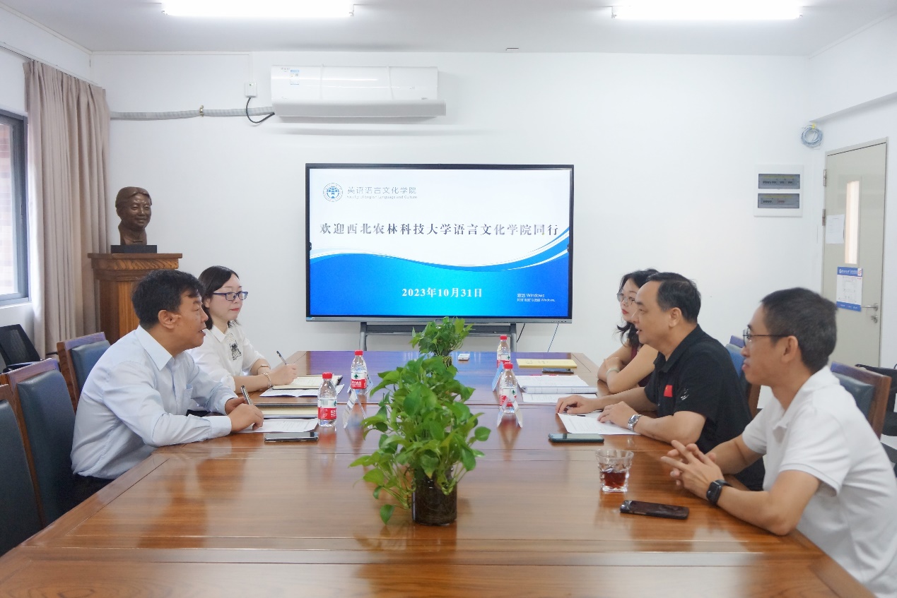 本网讯 2023年10月31日,西北农林科技大学语言文化学院副院长殷延军、英语系副主任王云副教授等一行来vwin德赢AC米兰官网进行工作调研交流。我院五级组织员何伟儒、英语教学部主任胡潇译副教授参加调研座谈会,会议在一教北446会议室进行。会议由何伟儒主持。本次调研围绕英语专业人才培养、师资队伍建设等方面展开。