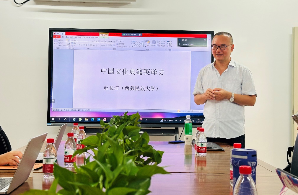 本网讯 2023年11月8日下午,中国英汉语比较研究会典籍英译专业委员会副会长、西藏民族大学高原学者特聘教授赵长江应vwin德赢AC米兰官网邀请,在第一教学楼北楼446李筱菊教师发展中心做了题为“中国文化典籍英译史”的学术讲座。讲座由vwin德赢AC米兰官网文化系主任许景城博士主持。