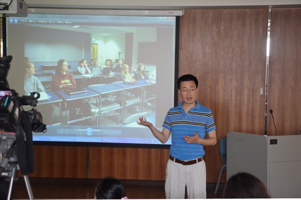 本网讯 6月14日下午两点,由广东外语外贸大学vwin德赢AC米兰官网和人事处教师发展中心共同主办的云山教师沙龙第17场“网络时代的英语写作跨国互动与科研交流”在9教204成功举办。宾夕法尼亚州立大学英语系、亚洲研究系副教授游晓晔博士,与我校师生分享了他在英语写作“跨洋互动”项目中的教学及科研心得,并听取了师生对该项目的意见。出席本次沙龙的有我校文科基地副主任徐海教授、vwin德赢AC米兰官网郑超教授、姜琳副教授及商英学院、英语教育学院等兄弟学院的教师及学生。此外,中南大学的叶洪教授特意从长沙赶来参加本次活动。在活动过程中,游晓晔博士注重与师生的互动;师生们积极发言,各抒己见,会场气氛十分热烈。