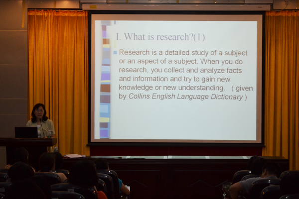 在第一部分中,谢元花就学术论文写作展开综合论述。首先,通过与观众的交流,谢元花阐述了“研究”的定义;在此基础上,她指出做研究的三个基本要素,即“研究问题”、“系统的研究方法”和“研究答案”。在第一个要素中,她用具体的实例向观众展示: 好的选题须具备“重要性”、“新颖性”和“可行性”。在第二个要素中,她介绍了系统的研究方法,并展示了研究问题和研究设计的关系。此外,她还从多个角度对比了两种主要的研究设计,即“定性研究”和“定量研究”的差异,并对这两种研究方法的运用进行了较详细的描述。紧接着,在第三个要素中,谢元花强调,做研究必须保证答案的有效性,否则研究结果会受到质疑。此外,她还讲述通过自己日常阅读和教学的经验,就论文结论和摘要的写作为观众提供了一些建议;并就论文抄袭的现象向观众提出忠告。