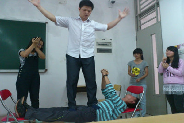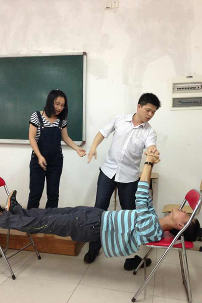 不可思议的事情发生了,龙贵瑜毫不费力地站在体验者的腹部上并停留片刻,在场观察的师生无不被催眠神奇的魔力所震撼,顿时全场惊呆。