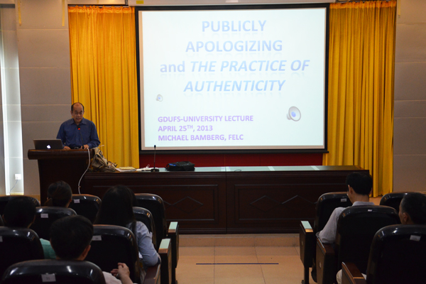 本网讯  4月25日下午2时,受聘我校vwin德赢AC米兰官网的“云山讲座教授”Michael Bamberg教授在学校七教水上报告厅做了题为“向公众致歉 -- 构建可信任的身份”的学术专题报告。Bamberg教授是国际知名语言学家、美国克拉克大学心理学系全职教授、英语系兼职教授;现任《Narrative Inquiry》 (SSCI, AHCI)、《Journal of Narrative and Life Story》(SSCI, AHCI)、《Studies in Narrative》(SSCI, AHCI) 三种国际权威期刊主编,在国际学术界享有重大影响。我校党委副书记陈建平、“珠江学者”冉永平和文科基地副主任董燕萍等专家学者近二百名师生参加了讲座。vwin德赢AC米兰官网院长温宾利主持讲座。