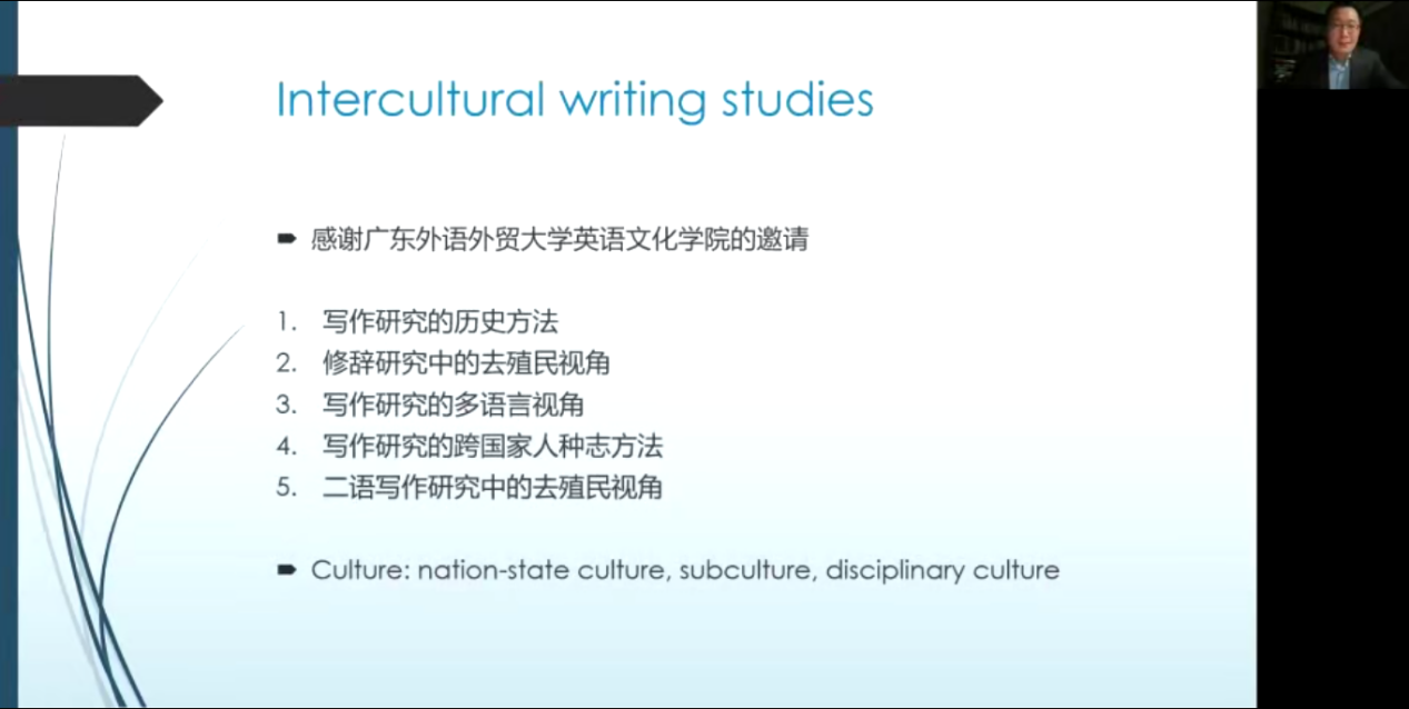 2021年12月25日上午,广东省海外名师项目《跨文化写作研究工作坊系列讲座》最后一次线上讲座圆满举行。本系列一共五次讲座,于2021年11月27日至12月25日期间每周六,在线上腾讯会议平台召开。本系列讲座邀请到美国宾州州立大学文学院英语系和亚洲研究系游晓晔教授主讲,游教授为我们讲述了跨文化语境下的英语写作与教学研究。该系列五次讲座分别由vwin德赢AC米兰官网牛瑞英、许勉君、杜寅寅、潘春梅和梁静璧主持,每次均有一百多位师生参加。