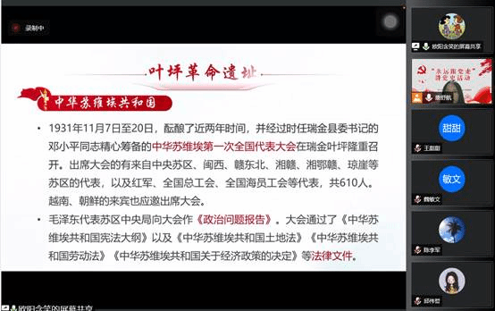 第一位党员代表欧阳含笑在讲述时说,自己的家乡江西瑞金就是一座红城,那里的叶坪和沙洲坝革命遗址更是革命的圣地和摇篮。瑞金是红军长征的起点,为了亲身感受它的历史文化,她在这个暑期特意去参观了包括中央革命根据地历史博物馆、苏维埃纪念园和革命烈士纪念馆等红色景区,通过分享带领大家一起感受当地的红色文化。她表示,整个瑞金充满着浓厚的红色文化气息,这从它的城市基础设施建设就可窥见一斑。比如瑞金的主干道就是红都大道,最繁华的中心就是红都广场,最有名的小学就叫八一小学和解放小学。叶坪革命遗址是中华苏维埃政权一大的召开地,中央临时政府在此成立,后来迁到沙洲坝并召开了二大,去掉了中央临时政府中的“临时”二字,正式成为中华苏维埃共和国中央政府。最后,她还表示欢迎大家到江西瑞金亲自感受当地的红色文化并交流学习。