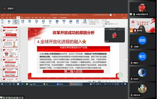 第二位党员代表林琳结合自己本科的国际贸易专业,以一个研究者的视角,分析了我国改革开放成功的原因。第一点就是发展道路的正确选择。政府鼓励一部分人先富起来、强起来,最终实现共同富裕。第二点是市场改革取向的坚持。在意识到市场经济的重要性后,逐步建立起市场经济体制与制度,但市场经济也有盲目滞后的弊端。所以我们采取市场经济和宏观调控相结合的方式,建立综合的经济发展模式。第三点是经济重心工作的发展。工作重心转移到经济上来后,我们引入大量的外商投资,解决资金、技术短缺等问题和新增就业。第四点是全球化进程的融入。加入世贸组织后,别国的关税降低对我们的出口贸易的发展极为有利,但为了在这个过程中保护民族工业,采取外商投资直接在国内办厂的举措,取得了实效。