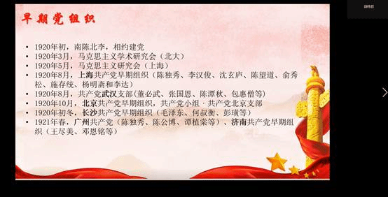 第三位党员代表邱伟哲选取中国共产党诞生的历史阶段,分享了建党的历史背景、早期党组织情况和党的一大等内容。她说,1917年的俄国十月革命的胜利给中国送来了马克思主义,奠定了建党的思想基础;而1919年的五四运动,促进了马克思主义同中国工人运动的结合,打下了建党的阶级基础。早期党组织一直致力宣传我们马克思主义和社会主义学说,比如李大钊撰写了《庶民的胜利》和《布尔什维主义的胜利》等,他们还到农村以及工农组织中去讲课,有效实现了马克思主义和工农运动的紧密结合。早期党组织在上海、武汉、北京、长沙、广州和济南等6个城市先后建立党组织,共约53名党员。一大是由每个早期党组织选派2名党员代表赶赴参加并于1921年7月23日晚召开。一大正式确立中国共产党的名称,通过《中国共产党的第一个纲领》,确定党的根本政治目的是实行社会革命。