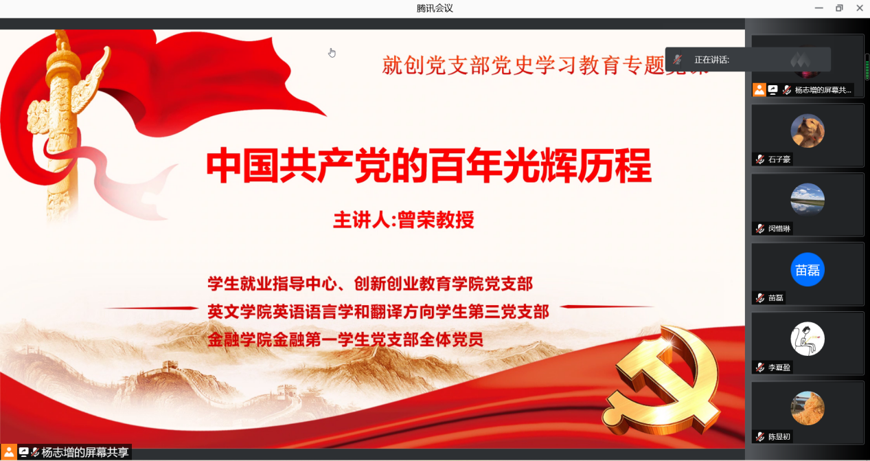 为深入开展好党史学习教育,扎实推进“我为群众办实事”实践活动,学生就业指导中心、创新创业教育学院党支部与vwin德赢AC米兰官网英语语言学和翻译方向学生第三党支部、金融学院金融第一学生党支部结对共建。三个共建支部于6月24日下午联合举办了“师生共建共学,砥砺初心使命” 党史学习教育专题党课。本次党课主题为“中国共产党百年光辉历程”,由我校党史学习教育宣讲团成员、马克思主义学院曾荣教授担任主讲。
