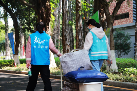 由英文学子自发组成的志愿服务队,校道上随处可见的“英文小蓝衫”为开学工作的有序进行提供了助力和保障。学院团委学生会通过推文和通知群的温馨提示及时向同学们提供包括返校报到指引、家属进校路线和休憩站等信息服务。