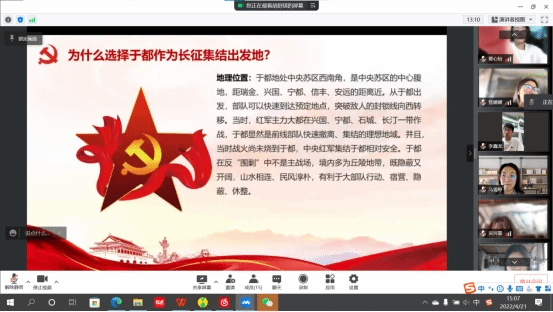 此次党日主题活动由胡舒琪同志向大家介绍自己家乡的红色土地:长征集结出发地——于都。胡舒琪同志首先介绍了于都县作为红色土地的来源:于都县政府提供的一份县情简介称,193410月,中央机关、中革军委和中央红军主力8.6万人集结于都,开始了举世闻名的二万五千里长征,于都从此作为地球上的红飘带的起点载入史册并闻名世界。随后胡舒琪同志从地理位置政治条件和物质条件三方面介绍了党之所以选择于都作为长征起点的原因