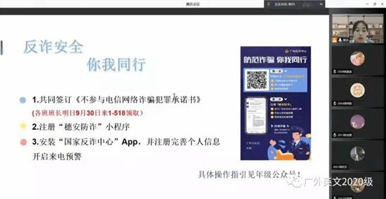 接着,韩丹老师围绕反诈安全、政治安全等方面对年级进行了相关安全教育。会上老师分享了自己的亲身经历,提醒全体同学提升自身反诈骗意识并且应保持冷静、寻求他人帮助,最后,她诚挚地祝愿同学们享受此次假期。会议结束,同学们纷纷表示自己强化了疫情防控意识,极大地提高了对各类诈骗的警惕性。