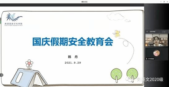 会上,韩丹老师首先传达了十一国庆假期安排和学校假期期间的出入管理办法,疫情防控重要时期,她在会上分析了目前全国疫情形势,向同学们强调了非必要不离校、非必要不聚集、非必要不出省三个“非必要”原则。并就疫情防控安全向年级同学提出三点要求:一是全体学生离校时应提交报备审批申请,及时、真实地上报外出时间、行程等相关信息,并提交相关申请材料。二是各位同学要积极配合完成校内晨晚检、健康打卡等各项防疫措施。三是全体同学在出行途中要避开中高风险地区并且做好个人防护工作。