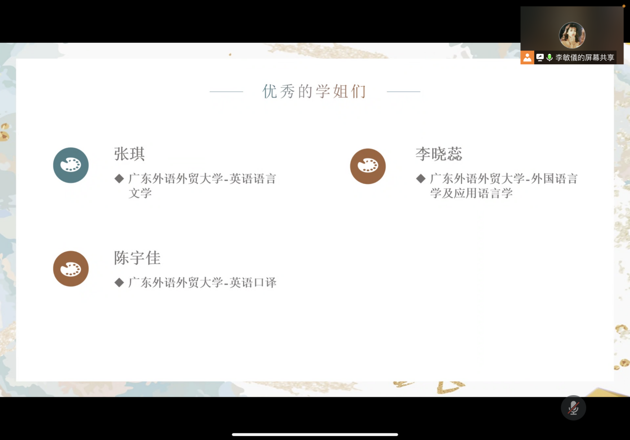 成功上岸广外英语语言文学的张琪师姐、广外外国语言学及应用语言学的李晓蕊师姐以及广外高翻学院英语口译的陈宇佳师姐分别介绍了各自的考研专业,并从个人经历出发,分享了备考时间安排、复习经验以及在备考过程中遇到的困难和应对的措施。针对同学们想了解的问题,三位师姐细致讲解了各自专业的考研情况及其择校的经验,分享了如何平衡学业、实习与备考、备考过程中的心态和身体调整、公共课备考经验及参考书目等。张琪师姐详细地介绍了复习二外日语的计划以及使用的资料,并列出了专业课复习的参考书目。李晓蕊师姐从自身情况出发,提醒同学们“提前规划,预留时间;不要犹豫,说干就干;任务分割,精确到天”。陈宇佳师姐将政治、基英、翻译、百科四门考试细细剖析,全面讲解了每一门的题型、分值以及复习要点,罗列了众多获取复习资料的途径,并附上了有关择校和考研心态调整等方面的tips