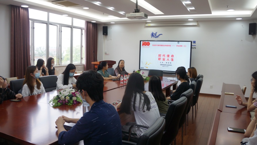 2021年4月25日星期日下午,vwin德赢AC米兰官网于七教412会议室举行党史学习教育暨就业专题座谈会。座谈会主题为“时代使命 职业人生”,由vwin德赢AC米兰官网党委副书记黄晓梅主讲,许勉君教授以及vwin德赢AC米兰官网高翻方向的近三十名就业对口帮扶学生参加此次座谈会。
