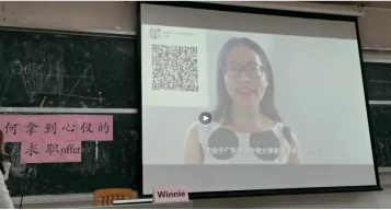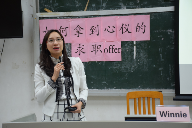 马艳红(Winnie)老师从“做出智慧的选择”、“打造心动简历”、“面试大通关”和“思路决定出路”四个主题出发,清楚地向同学们讲述了如何选择企业、如何撰写简历、面试前该如何准备以及在企业看来大学生该如何培养自身能力等焦点话题。