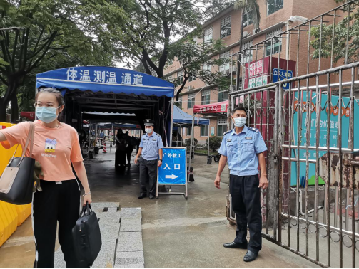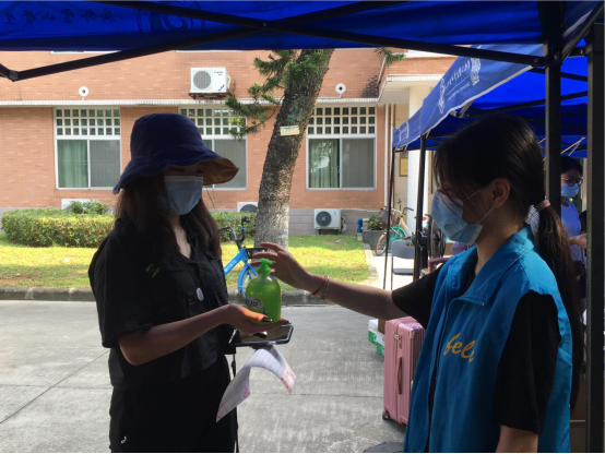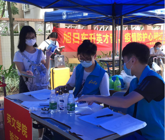 在学院接待岗,同学们再次接受测温并登记,出示行程卡和粤康码,以及事先审批通过的返校凭证,核验正常后确认返校。