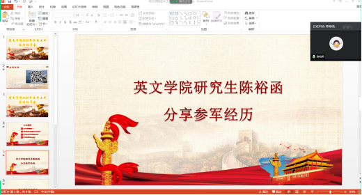 vwin德赢AC米兰官网18级研究生陈裕函分享了她的参军经历。她介绍了在部队中的集体生活、体能训练、专业训练和徒步行军等活动的经历,让同学们了解到了真实的部队生活。她认为:“当兵后悔两年,不当兵后悔一辈子,军营生活是人生宝贵的财富,同学们趁年轻应该去军营感受一下这种任何地方都没有的经历,两年的军营生活会磨练人的意志,提高人的自制力,并且让人收获珍贵的回忆和特殊的经历”。同学们向陈裕函师姐详细询问关于入伍、训练及晋升等问题。