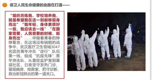 马骁老师还着重介绍了武汉这个英雄城市的一位快递小哥——汪勇,他是第24届“中国青年五四奖章”获得者,是在战“疫”中暖心奔走的“最美快递员”。在看到医护人员们在国家需要之时义无反顾地挺身而出,他深受震撼,克服了内心原本难以抗拒的面对生死的惧怕,主动承担起接送医护人员的任务,与时间赛跑,为病人赢得时间。